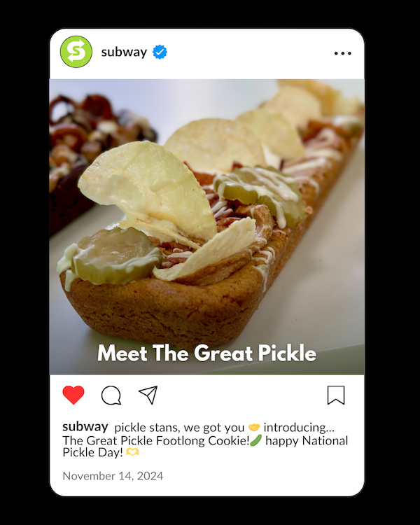 This cookie is sweet and salty and something you have never even dreamed of. The Great Pickle is a one-of-a-kind cookie that is topped with peanut butter, marshmallow crème, salty potato chips, crispy bacon crumbles, and Subway’s signature dill pickles. We dare you to try it!
